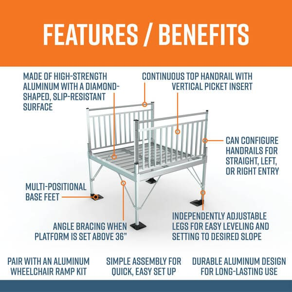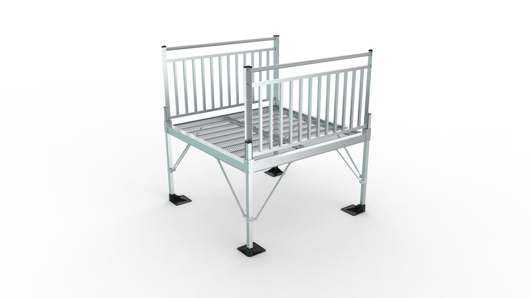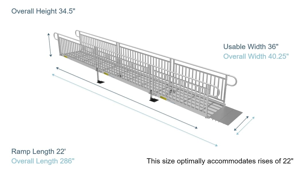 This 22’ ramp kit includes one 4' x 4' top platform (can be configured for straight, left, or right entry), one 4’ x 4’ turn platform, three 6' ramps, one 4’ ramp, handrails, and all other necessary components.