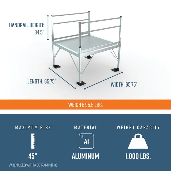 This 26’ ramp kit includes one 5' x 5' top platform (can be configured for straight, left, or right entry), three 6' ramps, two 4’ ramps, handrails, and all other necessary components.